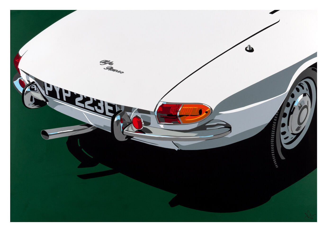 The focus of this Alfa Romeo art print is one of the most distinguished shapes in the automotive world. This Osso di Seppia (Italian for cuttlebone) car is a pure legend with its elegant curves and proven chassis. It also makes a fabulous appearance in the movie The Graduate with Dustin Hoffman behind the wheel.