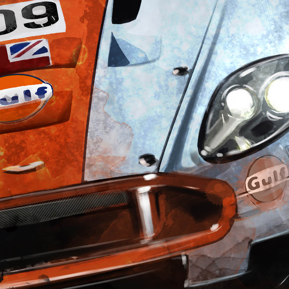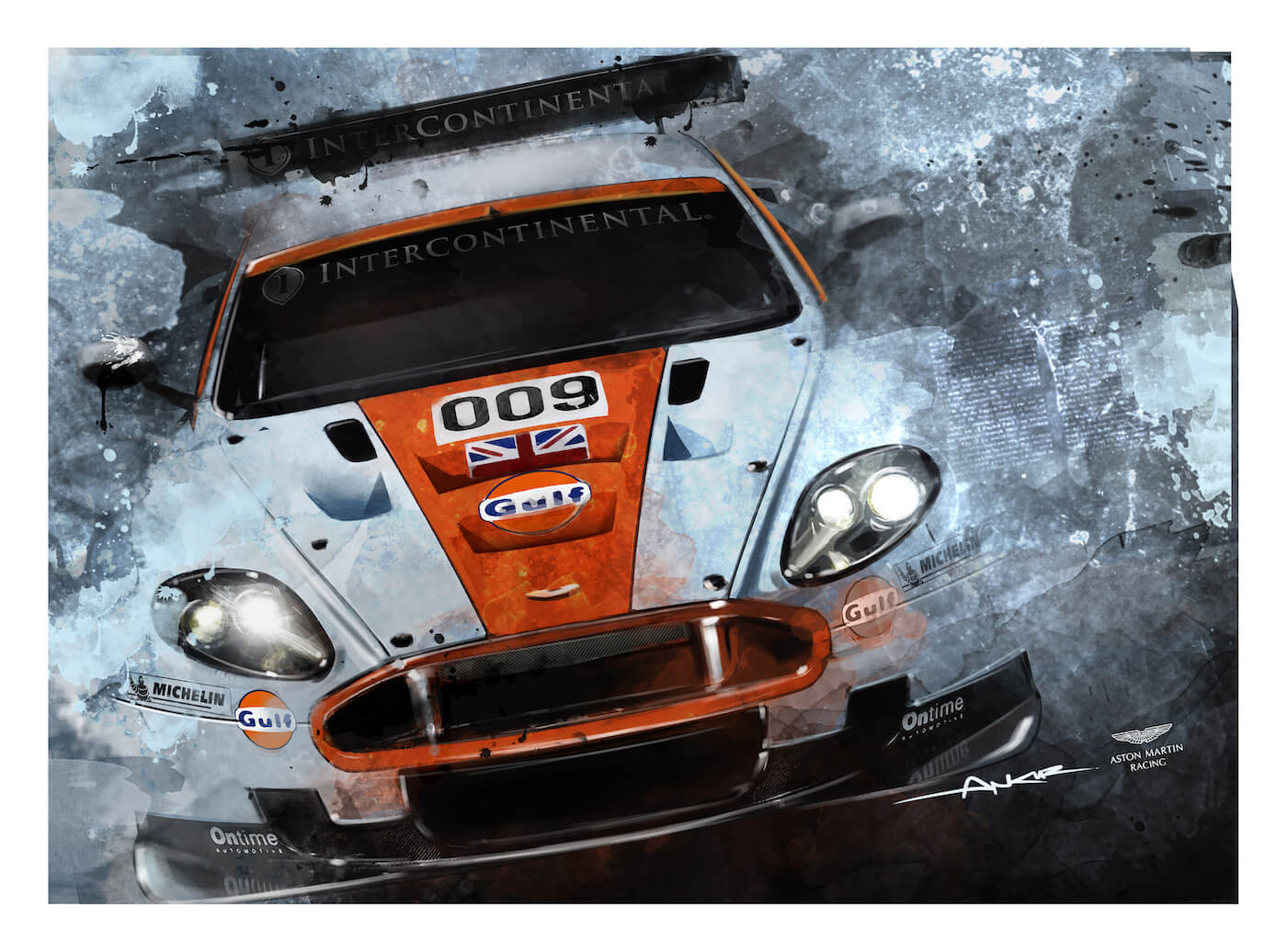 This Aston Martin DBR9 art is a Gulf-livery tribute to Le Mans