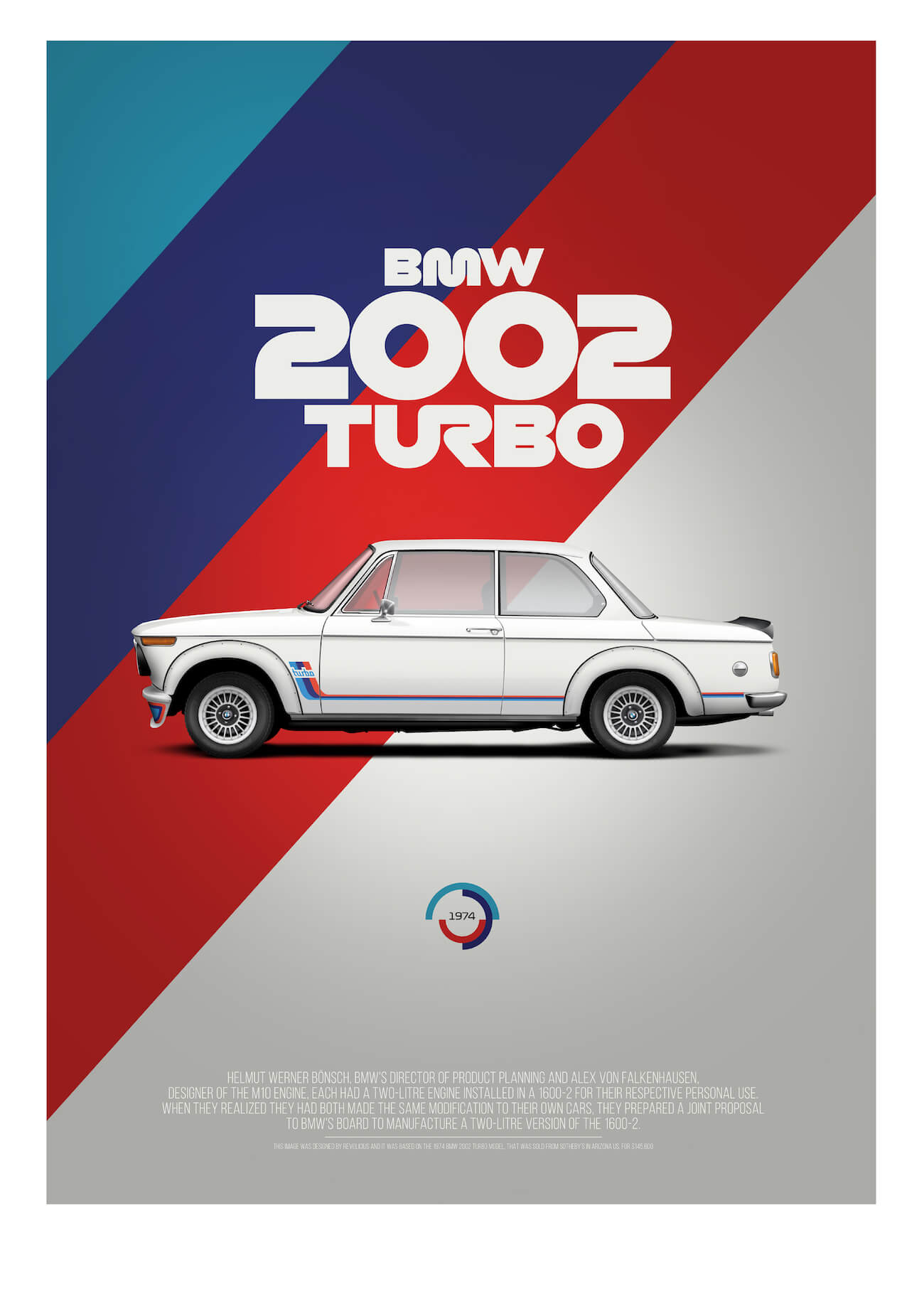 This BMW 2002 Turbo art print showcases the story of a pivotal model from the Bavarian manufacturer. What makes the BMW 2002 Turbo truly special is not just its striking Turbo body or its turbocharged engine. It's the car that secured BMW's presence in the United States and achieved the enduring status of a cool and iconic vehicle.