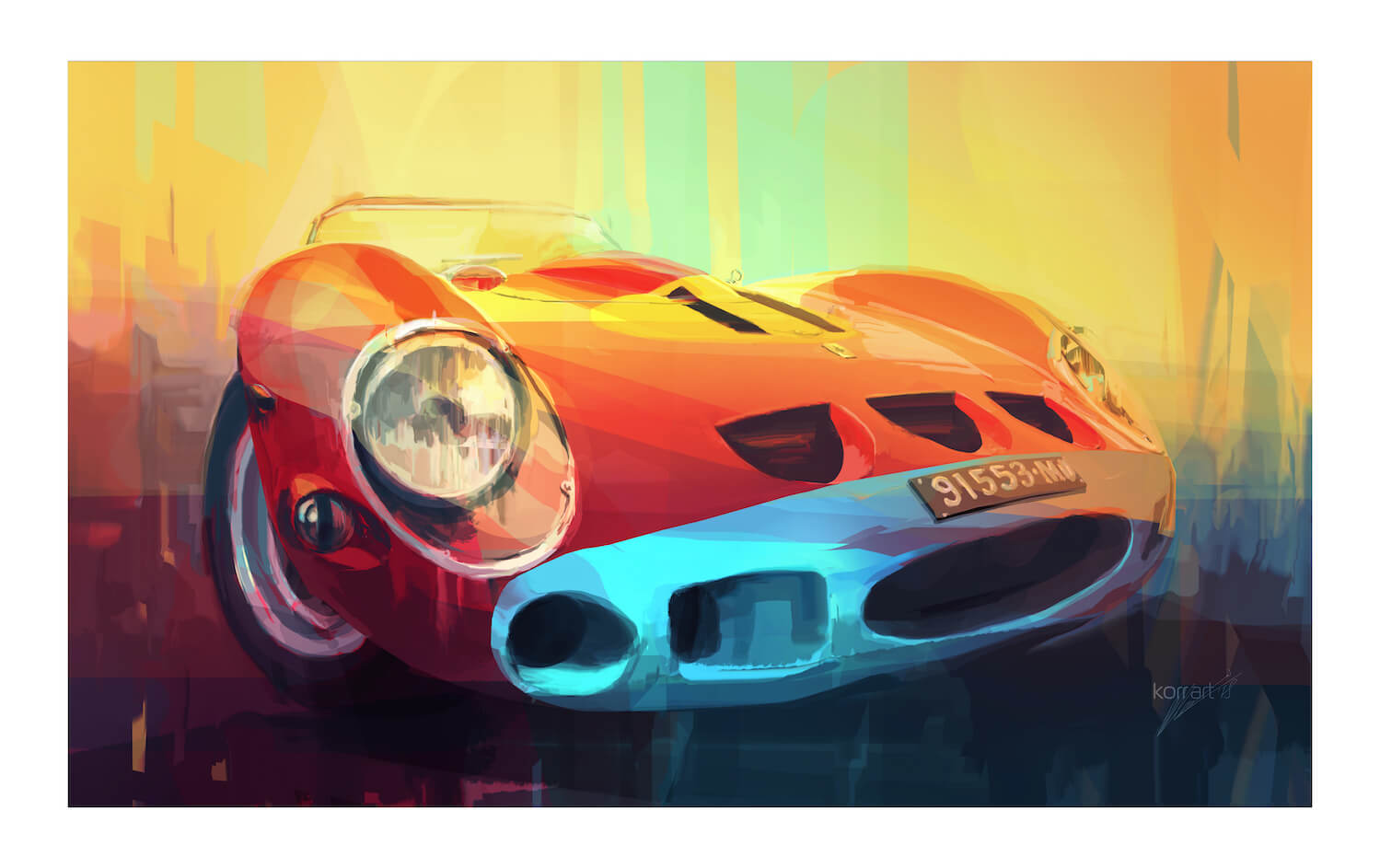 This Ferrari 250 GTO artwork by Artem Khalko features the car that has been in the hands of Graham Hill, Innes Ireland, Mike Parkes and Jack Sears. Naturally, it wins a bunch of competitions, including the '63 Tourist Trophy at Goodwood and the Spa 500. Initially ordered by Colonel Ronnie Hoare, this 250 GTO is as British as it can be.