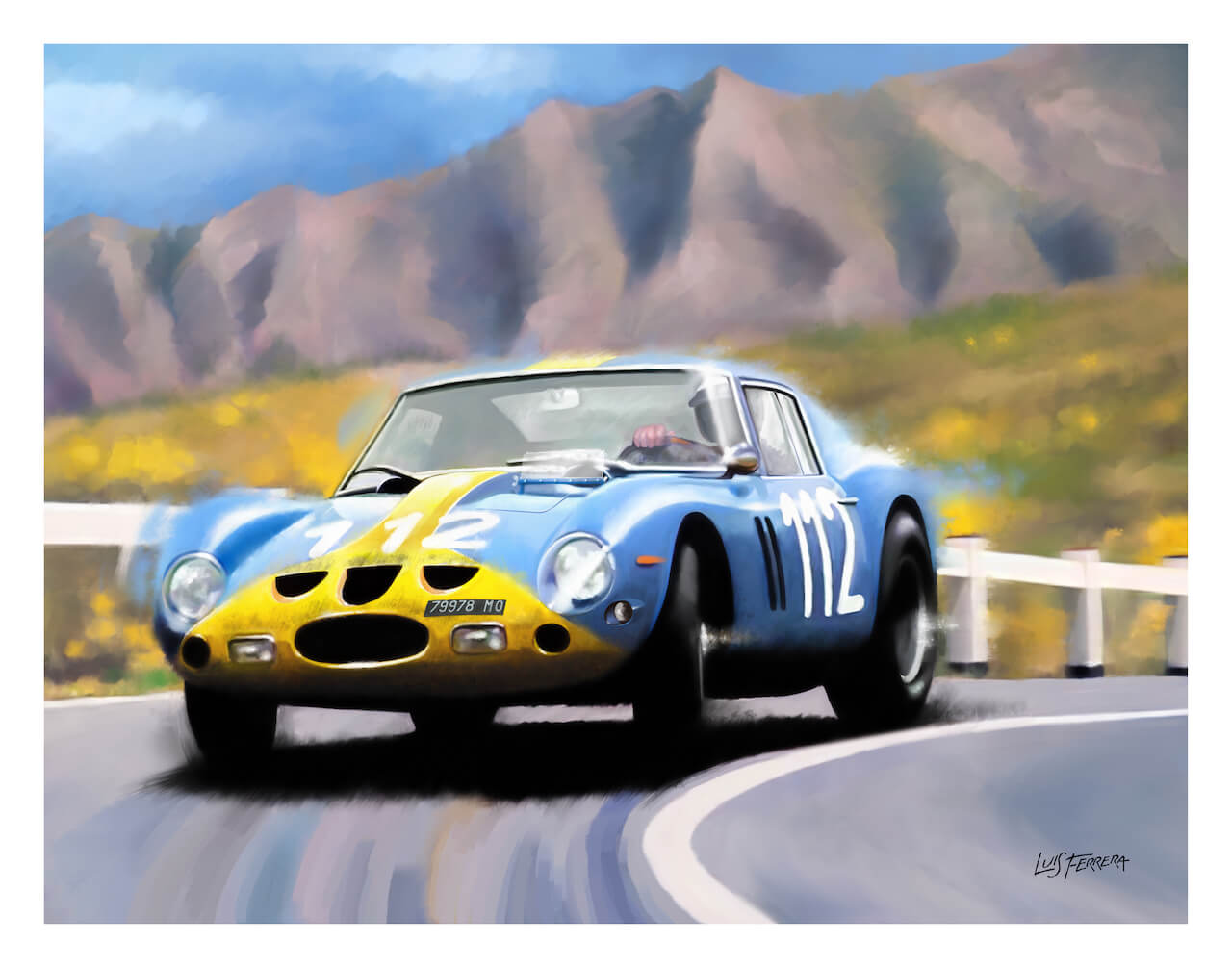 This Ferrari 250 GTO art captures one of the most iconic Ferrari cars during its run at the Targa Florio in 1964. The story of the blue-yellow 250 GTO is truly exciting, especially having in mind the fact that it still exists in this livery and is in a fully restored condition.