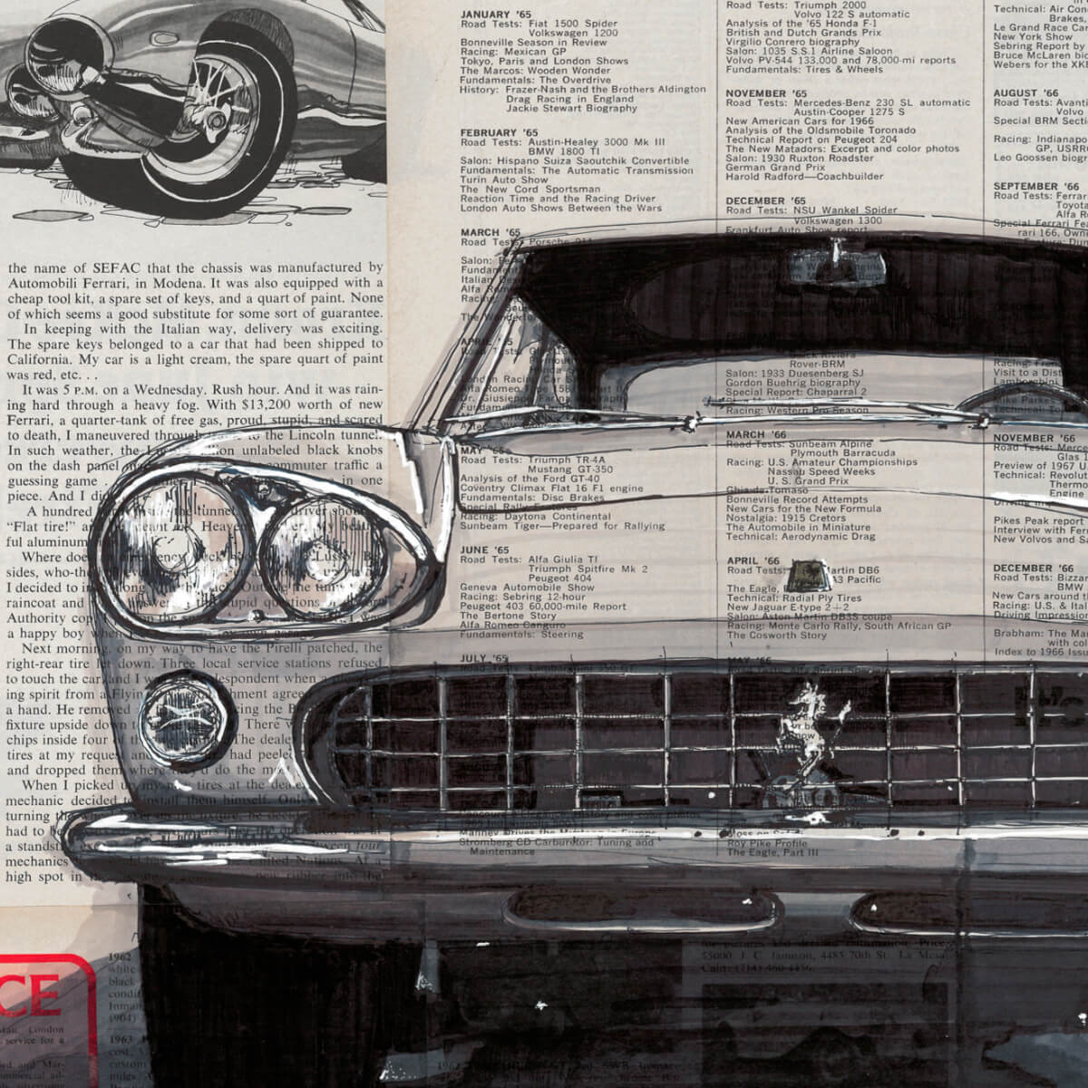 Just like the rest of his artworks, Adam Ambro creates this one on old school print media. This time he chooses a Road & Track edition covering 1964 Le Mans. You can also spot a headline like “So you`d like to own a Ferrari?” which we find highly suggestive. You can order now your Ferrari 330 GT 2+2 Series 1 art print by Adam Ambro at Simply Petrol marketplace.
