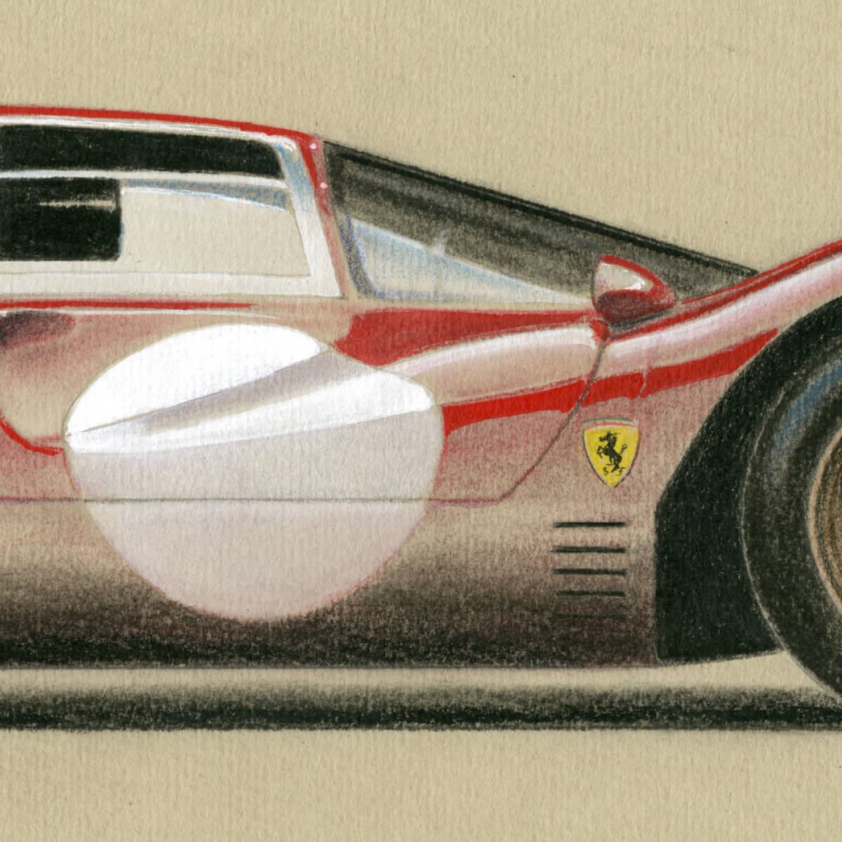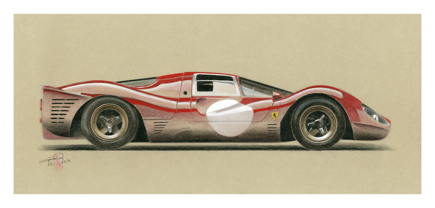 Henry Ford vs. Enzo Ferrari and GT40 vs 330 P3/4. This is a story of ego, money, racing, and myths. A story that gives us not only one of the most captivating endurance racing rivalries but also one of the most beautiful racing cars ever. Meet the stunning Ferrari 330 P3/4 depicted as fine car art by artist Nicolas Cancelier. The iconic car coming out of the small town of Maranello is a true inspiration to Cancelier.