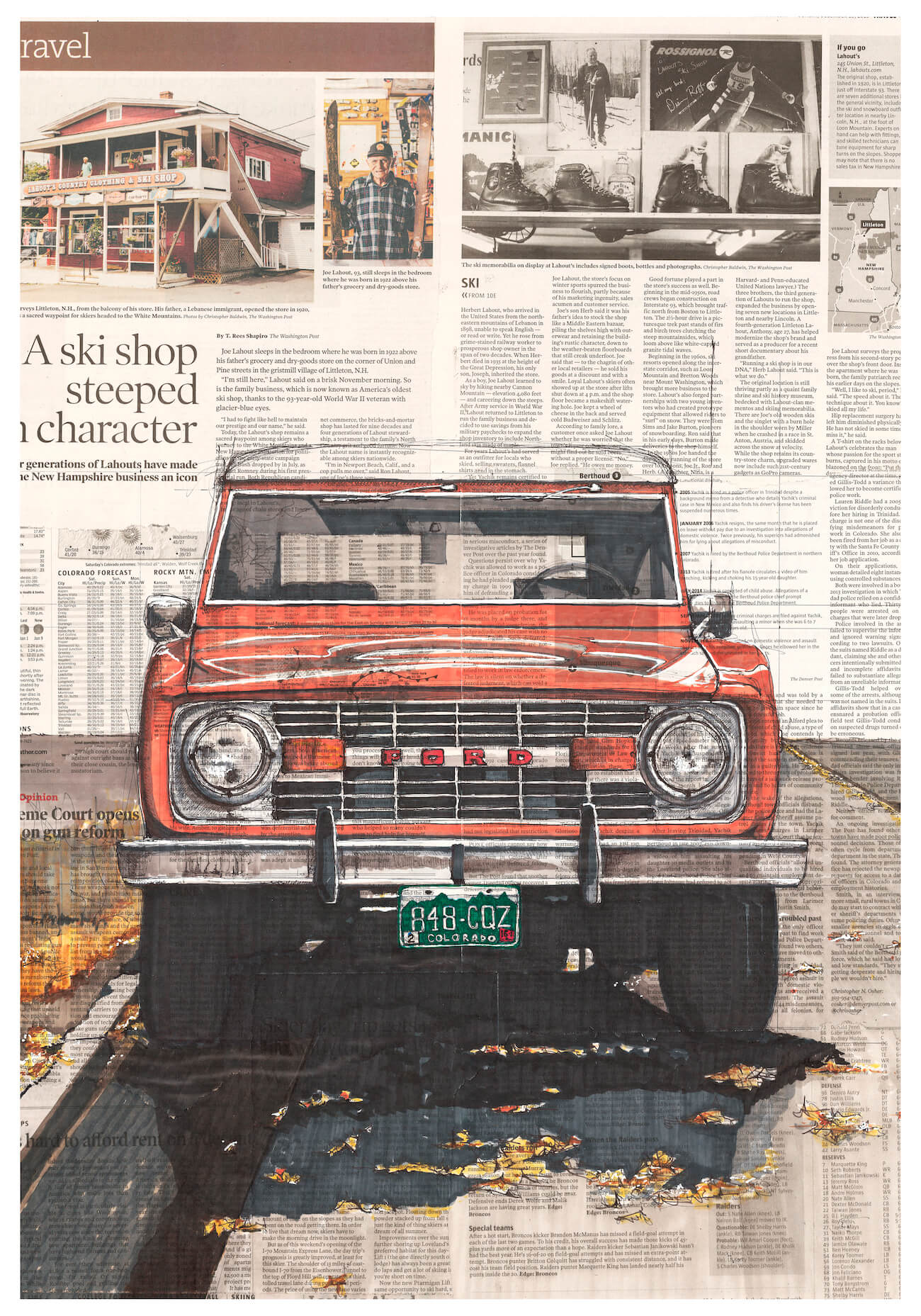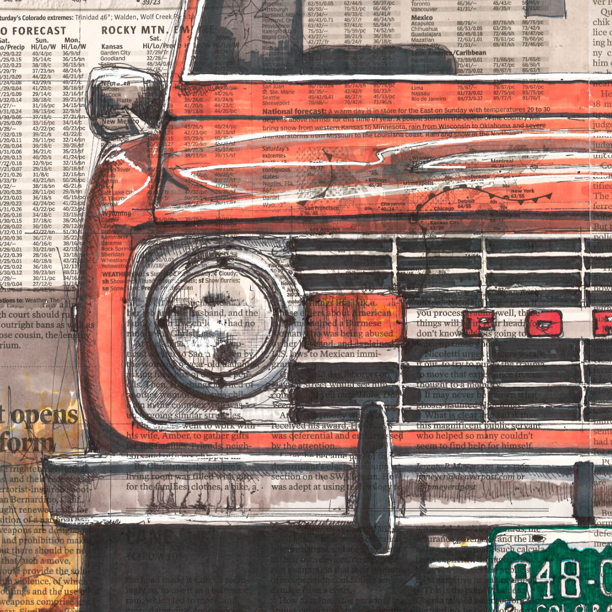 Having grown up in Michigan in a three-bedroom house with a five-car garage, it’s only natural that Adam’s eye gravitates towards the auto industry for inspiration – for both the subjects and the classified ads that served as the original canvases. With true classified ads becoming scarce, as much thought is now put into composing the newsprint canvas as the artwork itself. Each canvas is uniquely curated towards the adventure-based subjects leaving much to be discovered beyond the details of the drawing. Based in Golden, Colorado,