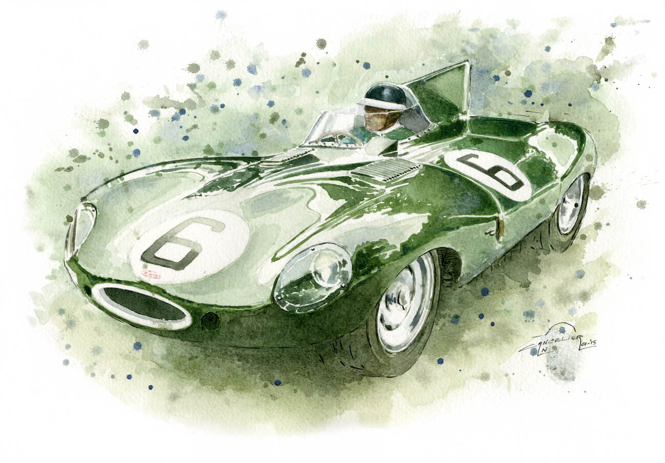 This art print showcases the iconic Jaguar D-Type that triumphed at Le Mans in the 1955 season, driven by the talented duo of Mike Hawthorn and Ivor Bueb. The race began with a memorable 3-hour battle between Hawthorn and Juan Manuel Fangio, during which the D-Type set a lap record. This racing Jaguar, a true blue-blood of endurance, was meticulously engineered and built with aerodynamics as a top priority, resembling the precision of an aircraft.