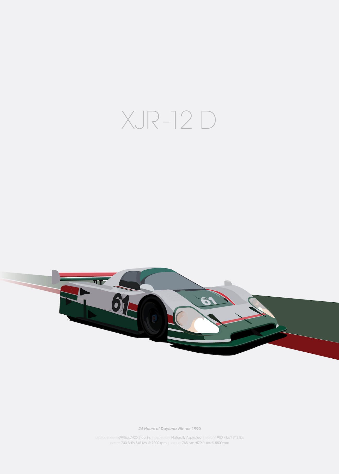 The XJR-12 is Tom Walkinshaw's last project in partnership with Jaguar. This racer is meant to replace the successful Jaguar XJR-9. Just like its predecessor, the new racing car is capable of racing both in Group C endurance prototypes and in IMSA series in the USA. This stylish Jaguar XJR-12 poster art tells the story of the car as seen by artist Pete Dials.