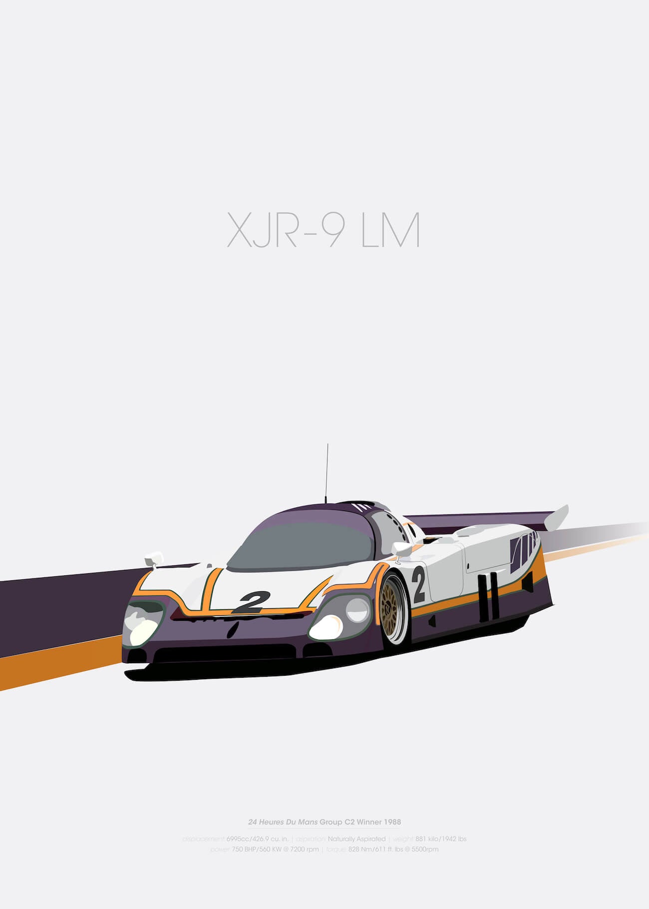 Jaguar D-Type has five wins out of seven Le Mans entries but this success comes to its natural end after season 1957 when the D-Type becomes obsolete. 30 years later, Jaguar enters endurance racing again. The company creates a batch of XJR racers and some of them became victorious. This Jaguar XJR-9 LM poster by Pete Dials is about the glory days of the British vehicle.