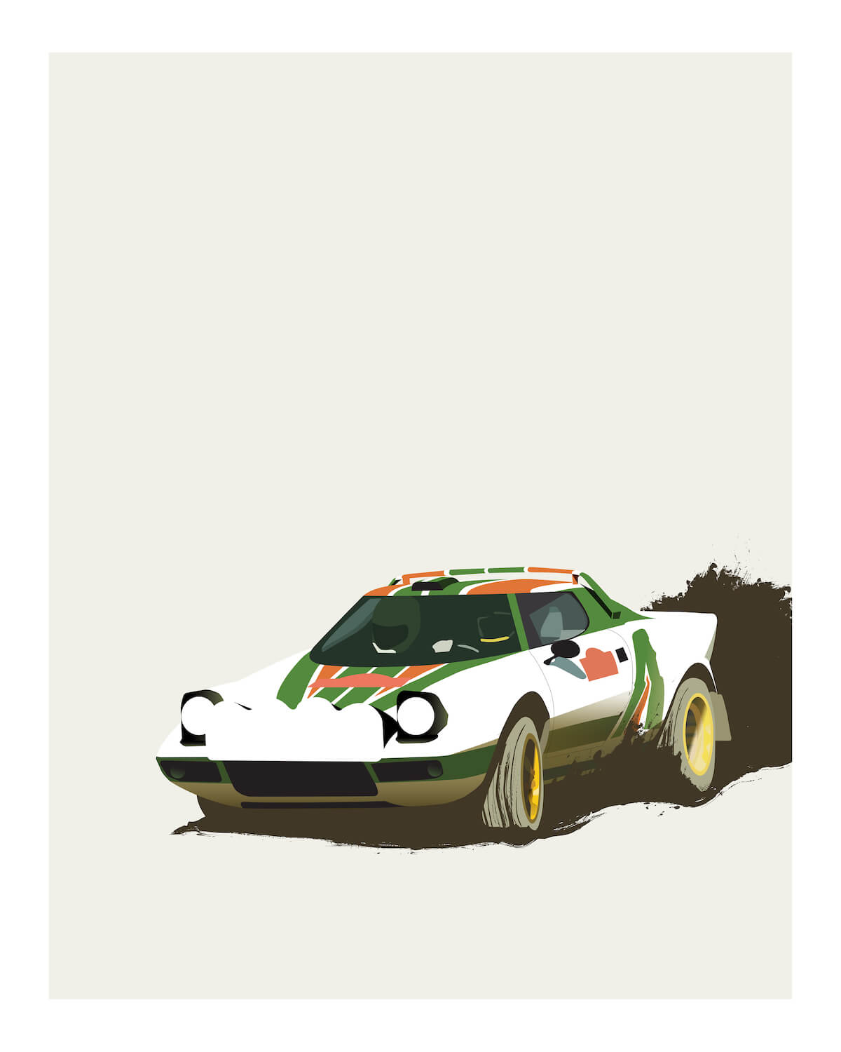 This poster pays tribute to Lancia Stratos HF - the '70s ultimate rally beast in a compact form. In the Alitalia livery, this Lancia Tipo 829 is nothing but phenomenal.