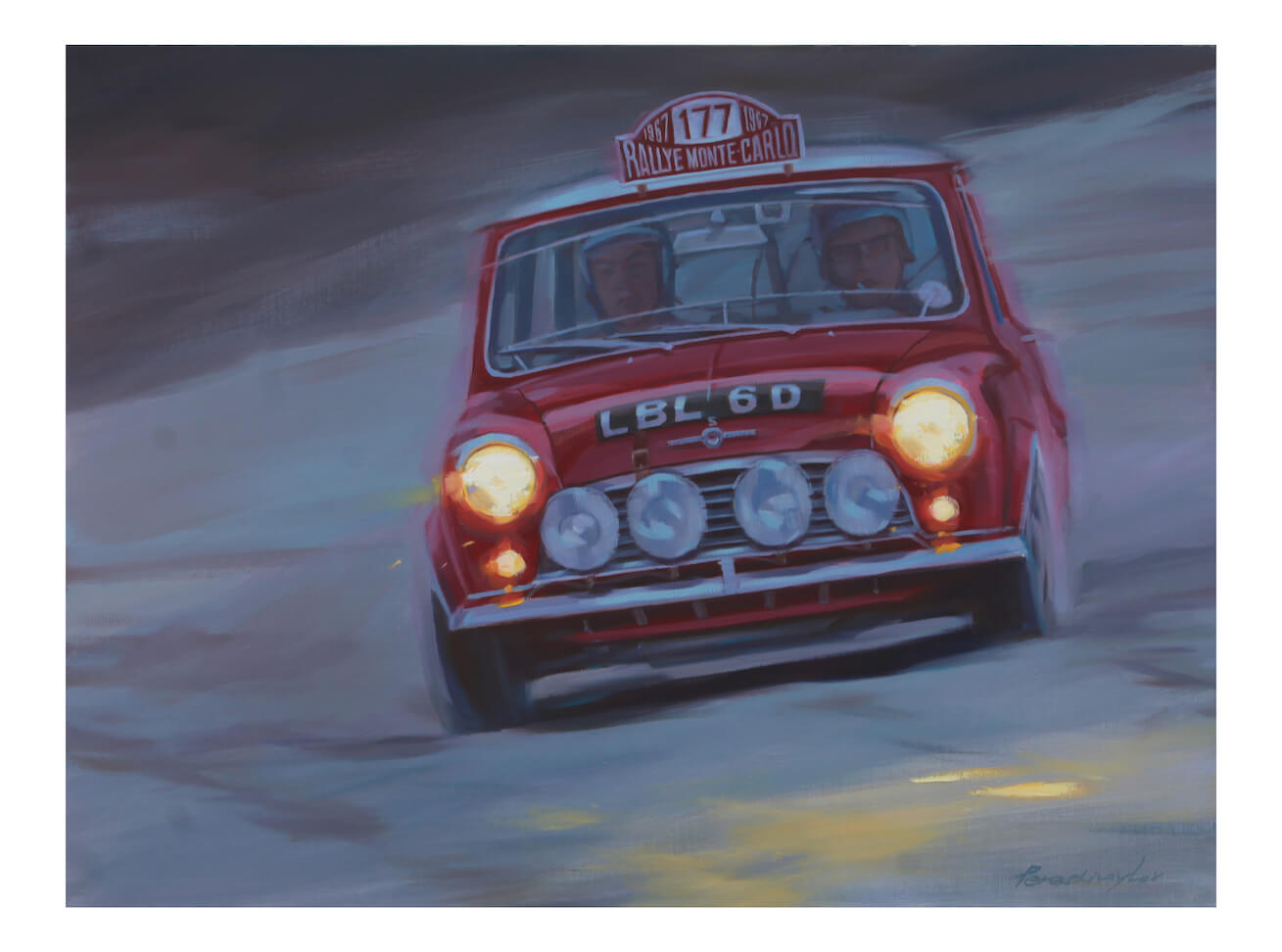 This beautiful painting depicts a moment from 1967 Monte Carlo Rally undisputedly won by Rauno Aaltonen and his Mini Cooper S. Undisputedly because the year before all three Mini-s placed from 1st to 3rd were disqualified because of lights that allegedly did not conform with the official regulations. So in 1967, Aaltonen and Henry Liddon as co-driver were good enough for the win.