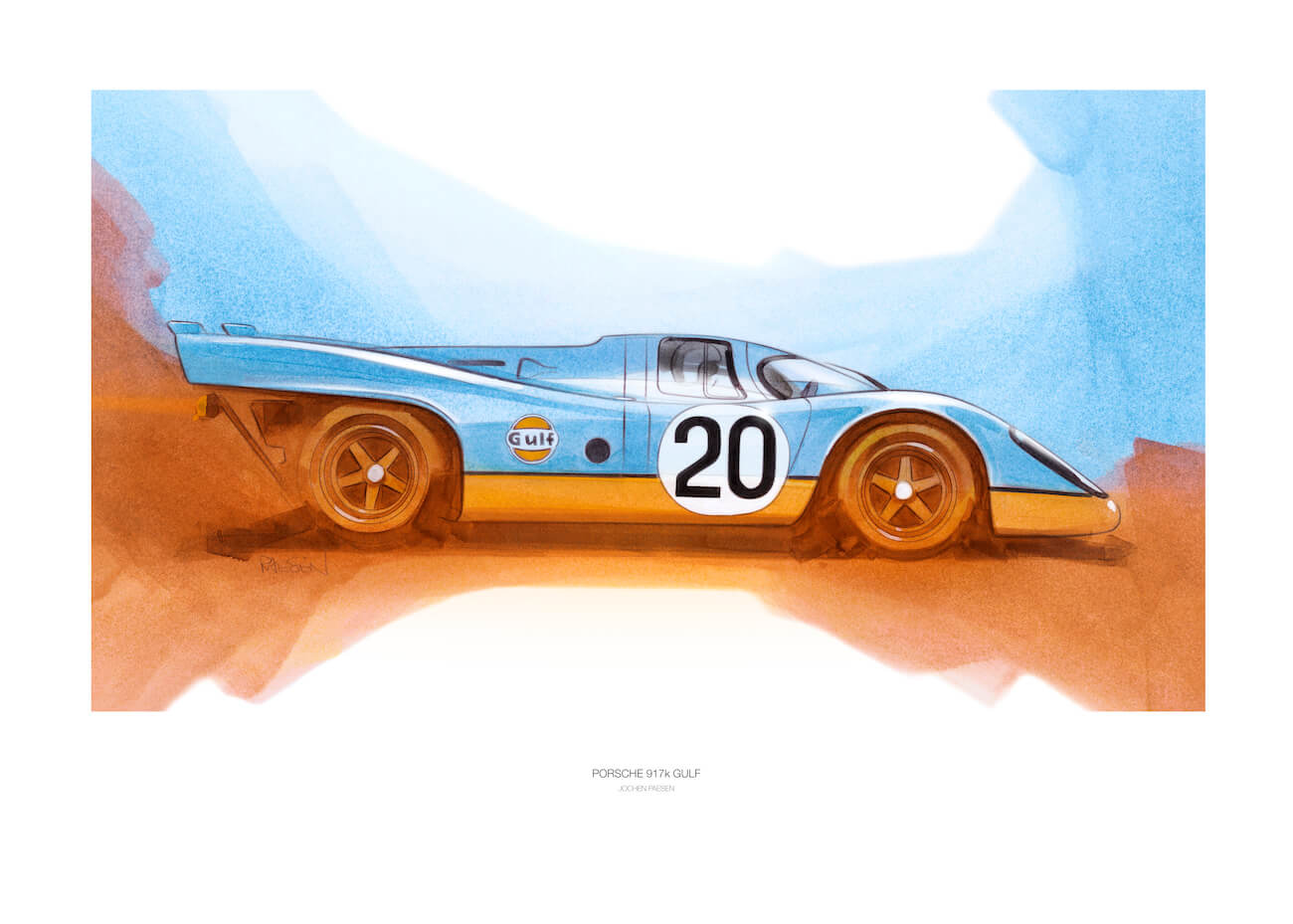 Is it the strange shape or the breath-taking power features? Maybe it's the striking blue and orange livery? We can't say for sure what makes our love for Porsche 917 Gulf poster art that strong. We always have a place in our hearts for one more Porsche art piece. This one is created by the talented Jochen Paesen.