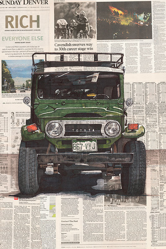 Having grown up in Michigan in a three-bedroom house with a five-car garage, it’s only natural that Adam’s eye gravitates towards the auto industry for inspiration – for both the subjects and the classified ads that served as the original canvases. With true classified ads becoming scarce, as much thought is now put into composing the newsprint canvas as the artwork itself. Each canvas is uniquely curated towards the adventure-based subjects leaving much to be discovered beyond the details of the drawing. Based in Golden, Colorado,